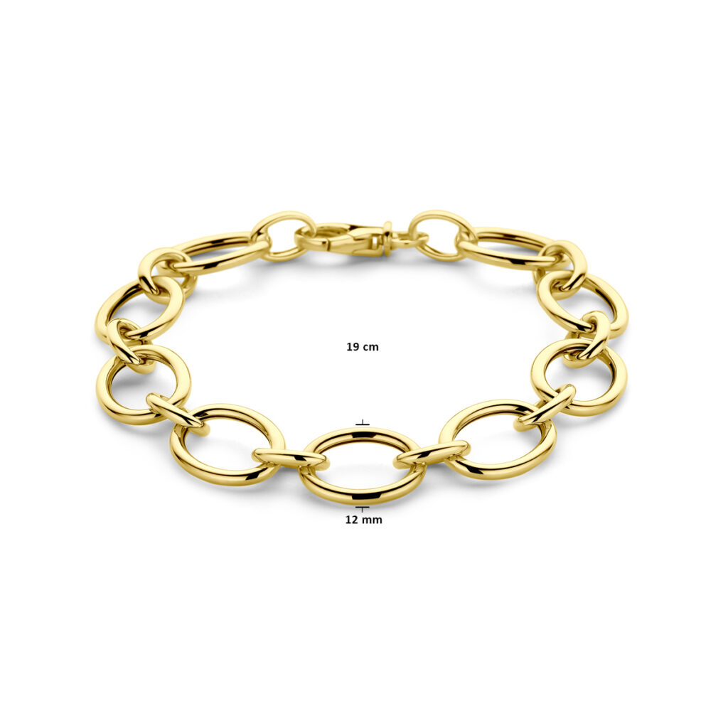 Stijlvolle 14K gouden damesarmband met een elegante karabijnsluiting. Deze damesarmband heeft een draaglengte van 19 cm en combineert schakels van 7,7 mm en 12 mm breed, wat zorgt voor een verfijnd en speels ontwerp. Perfect voor elke gelegenheid.