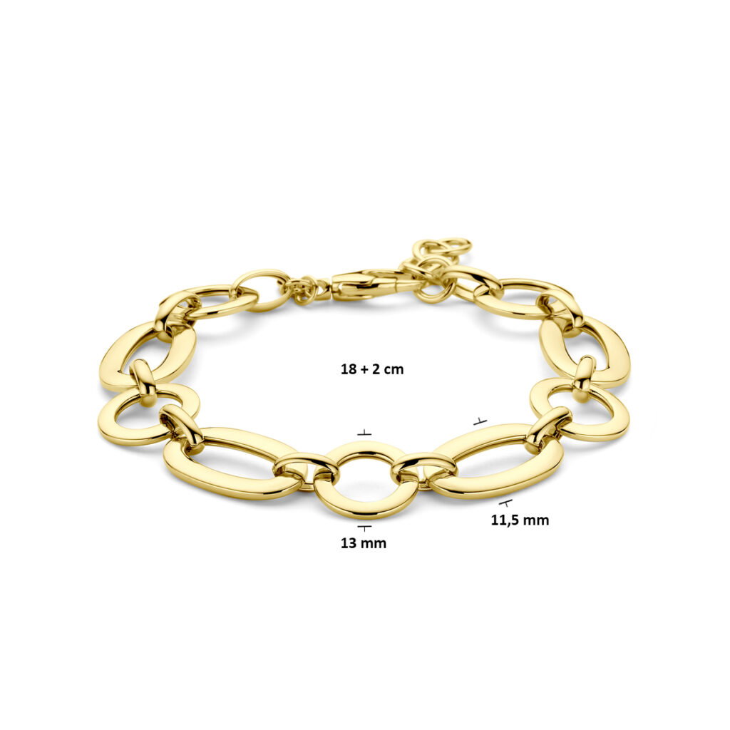 Prachtige 14K gouden damesarmband met een verstelbare draaglengte van 18 cm en een extra 2 cm extensie. Deze verfijnde damesarmband is voorzien van een karabijnsluiting en een schakelbreedte van 12,8 mm, wat zorgt voor een luxe uitstraling. Een tijdloos sieraad voor elke gelegenheid.