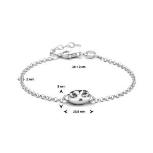 Gerhodineerd 925 zilveren armband met een schakelachtig element van 8×10.8mm en een schakelbreedte van 2mm. De armband heeft een draaglengte van 16cm met een extensie van 3cm. Uitgevoerd met een karabijnsluiting.