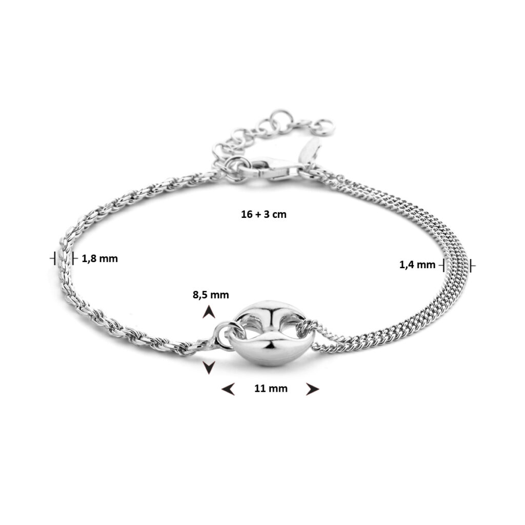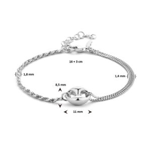 Gerhodineerd 925 zilveren armband met een schakelachtig element van 8.5x11mm. De armband heeft draaglengte 16cm en een extensie van 3cm. Uitgevoerd met een karabijn sluiting. De schakelbreedte is 1.8mm.