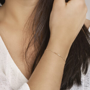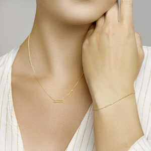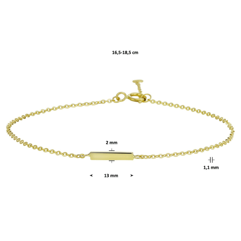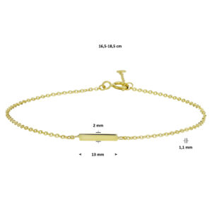 Geelgouden armband uitgevoerd met een balkje van 2x13mm. Met draaglengtes van 16.5 en 18.5cm. De schakelbreedte is 1.1mm.