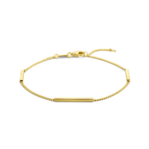 14k Geelgouden armband uitgevoerd met balkjes en een karabijn sluiting. De armband heeft draaglengtes van 17 en 19cm. De schakelbreedte is 1.3mm.