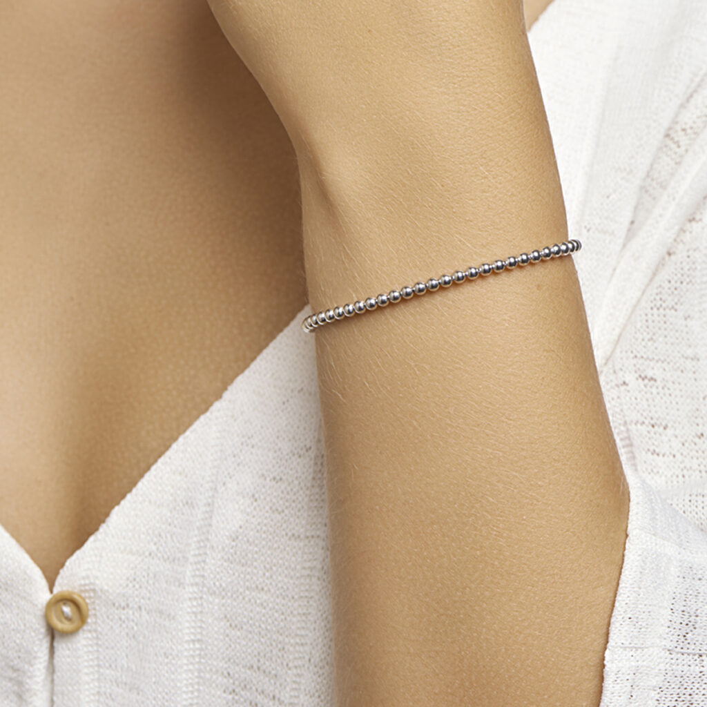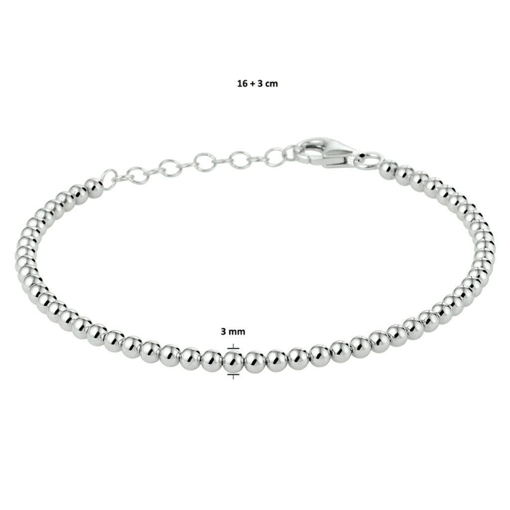Trendy gerhodineerd zilveren armband met een draaglengte van 16cm en een extensie van 3cm. Uitgevoerd met bolletjes van 3mm in diameter en een stevige karabijn sluiting. Info: Gerhodineerd zilver is door de rhodiumlaag beter bestand tegen verkleuren en krassen.