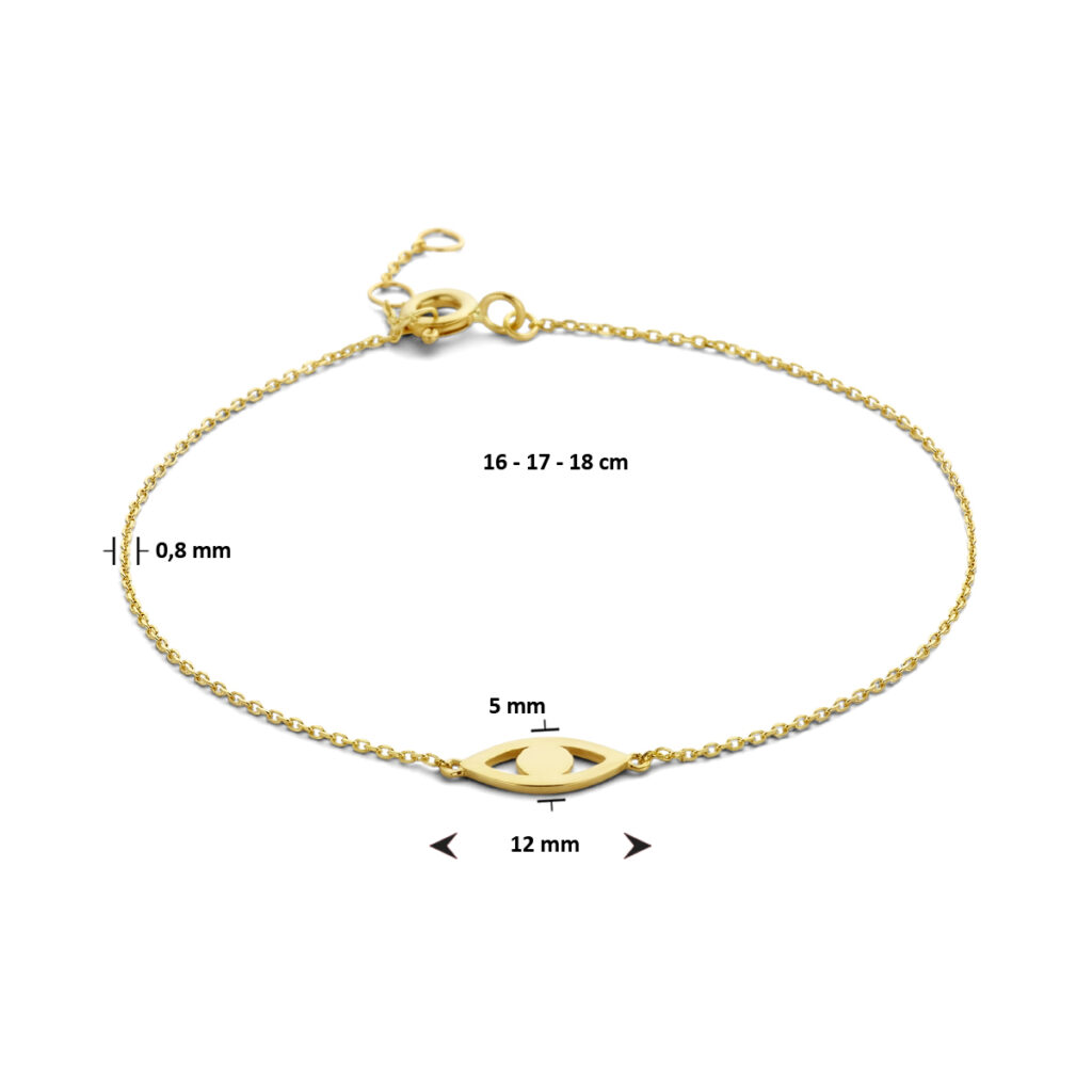 14k Geelgouden armband met een boze oog voorstelling. De armband heeft draaglengte van 16, 17 en 18cm. De schakelbreedte is 0.8mm.