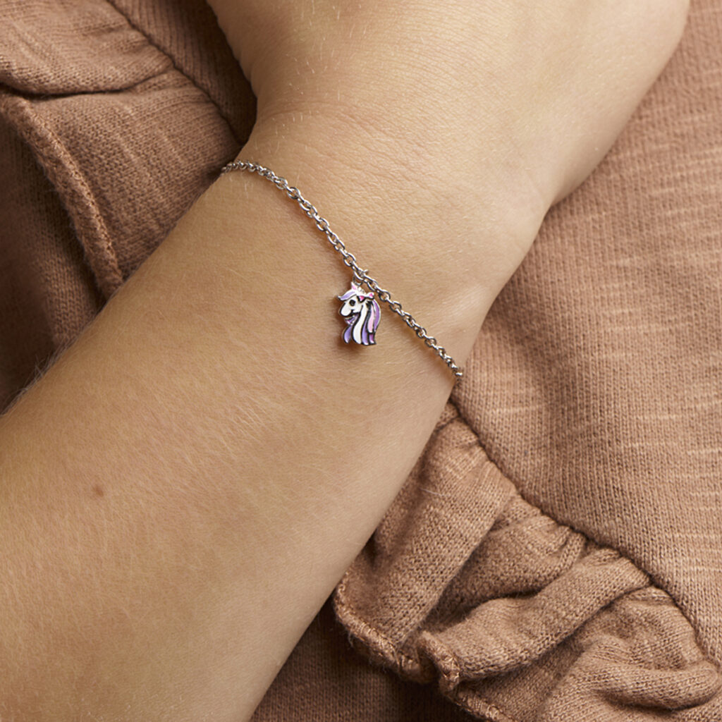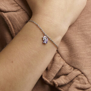 Gerhodineerd 925 zilveren armband uitgevoerd met een leuke eenhoorn hanger en een stevige karabijn sluiting. De armband heeft een draaglengte van 13cm en een extensie van 3cm. De afmeting van de hanger is 11x7mm. De schakelbreedte is 1.8mm.