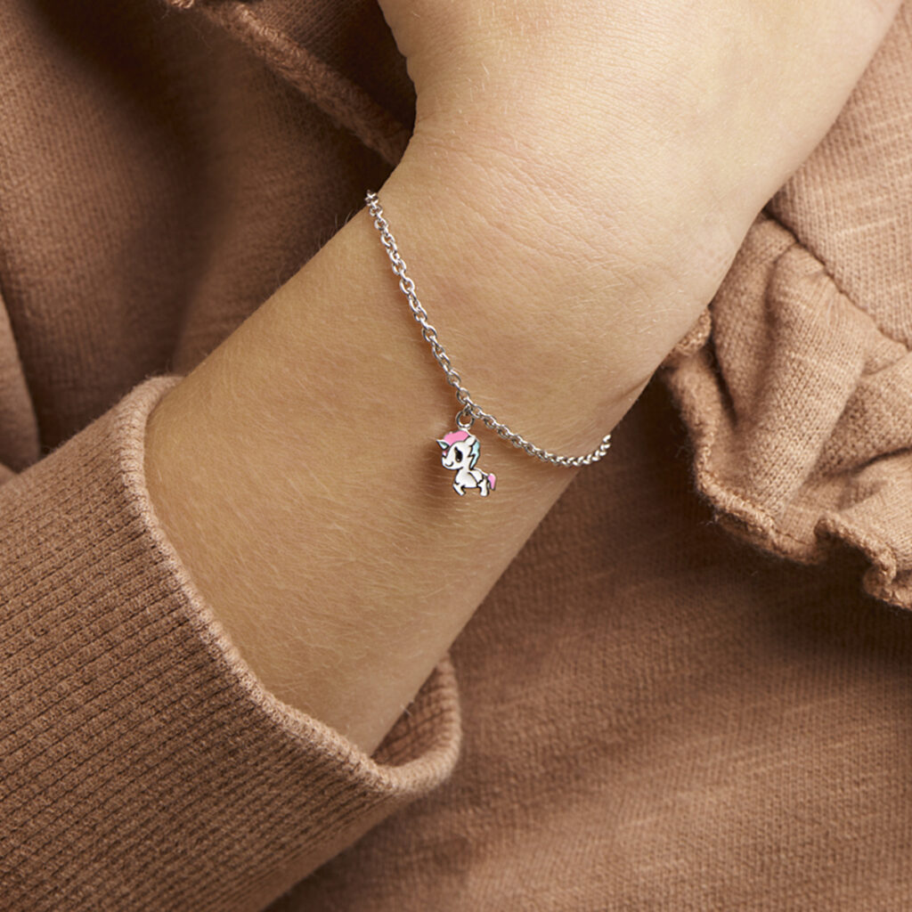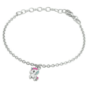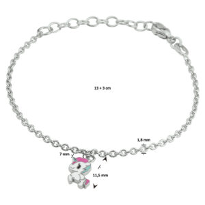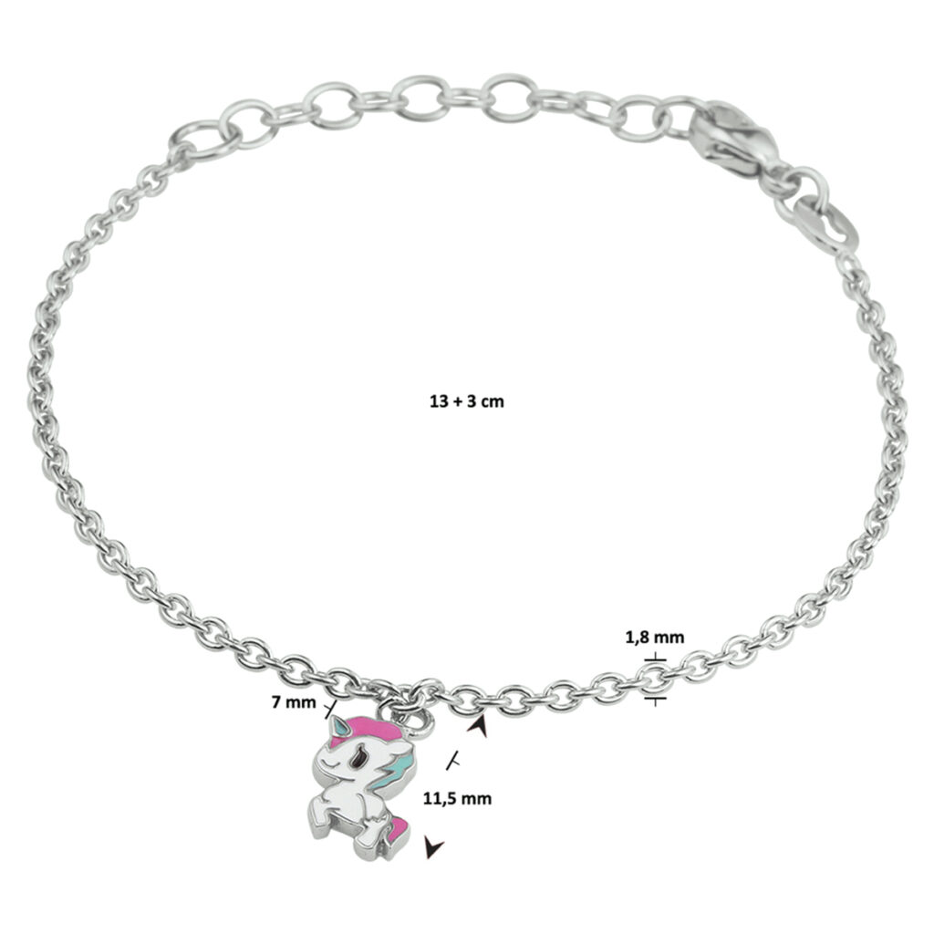 Gerhodineerd 925 zilveren armband uitgevoerd met een leuke eenhoorn hanger en stevige karabijn sluiting. De armband heeft een draaglengte van 13cm en een extensie van 3cm. De afmeting van de hanger is 11.5x7mm. De schakelbreedte is 1.8mm.