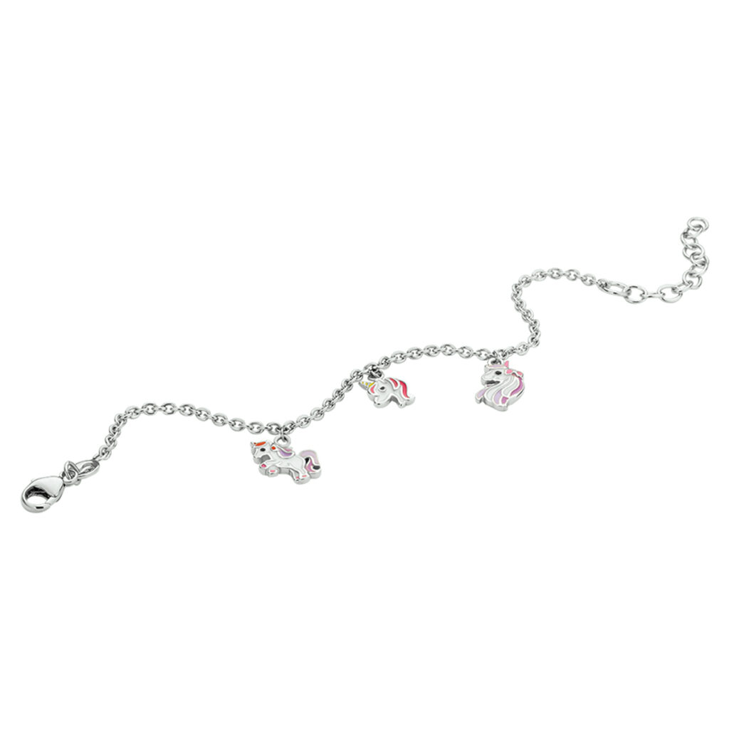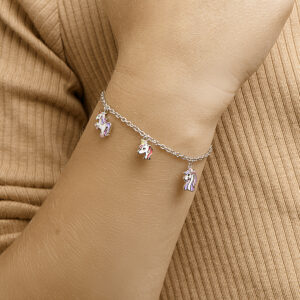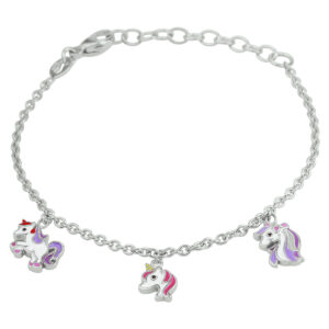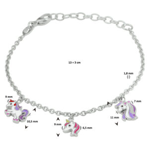 Deze schakelarmband met eenhoorn bedels zijn gemaakt van 925 sterling zilver, de allerbeste kwaliteit zilver, met een fijntjes gepolijst oppervlak dat mooi glanst met een laagje rhodium waardoor die glans extra lang behouden blijft. Deze armband bestaat uit meerdere slanke Anker schakels die fijntjes op elkaar aansluiten en die samen een stijlvol geheel vormen, met aan de voorkant drie bedels met een eenhoorn thema en diverse kleuren emaille. Aan de achterkant zit een handige karabijnsluiting, waardoor u deze armband gemakkelijk om- en afdoet. De armband heeft een lengte van 16cm met draaglengtes van 13cm en 16cm.