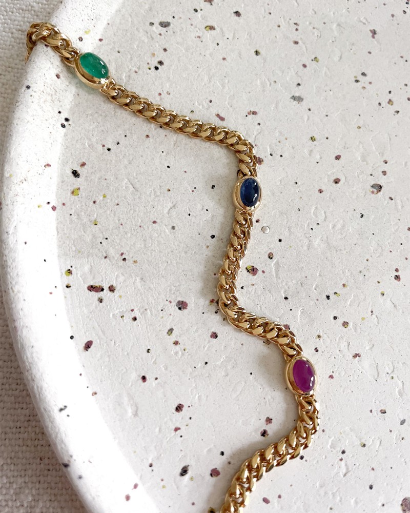 Deze armband is afkomstig van het merk Excellent Jewelry dat alweer 25 jaar een toonaangevende Nederlandse sieradenleverancier en vaste partner van vele Nederlandse juweliershuizen is. Zo is deze armband gemaakt van geelgoud van de allerbeste kwaliteit en bestaat deze uit meerdere beeldschone schakels die fijntjes op elkaar aansluiten met vier gekleurde edelstenen (saffier, robijn, smaragd, cabuchon) die mooi glanzen. Verder is de armband aan de achterkant voorzien van een handige karabijnsluiting, waardoor u deze armband gemakkelijk om- en afdoet. De armband heeft een lengte van 19cm met een breedte van 5mm.