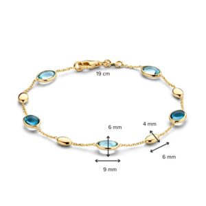 Deze armband is afkomstig van het merk Excellent Jewelry dat alweer 25 jaar een toonaangevende Nederlandse sieradenleverancier en vaste partner van vele Nederlandse juweliershuizen is. Zo is deze armband gemaakt van geelgoud van de allerbeste kwaliteit en bestaat deze uit meerdere slanke schakels die fijntjes op elkaar aansluiten en die samen een stijlvol geheel vormen, met meerdere ovaalvormige plaatjes waarvan er vijf zijn voorzien van beeldschone blauwe edelstenen (topaas en London Blue topaas) die mooi glinsteren. Verder is de armband aan de achterkant voorzien van een handige karabijnsluiting, waardoor u deze gemakkelijk om- en afdoet. De armband heeft een lengte van 19cm.