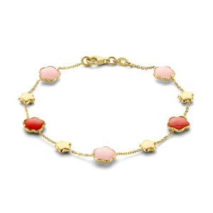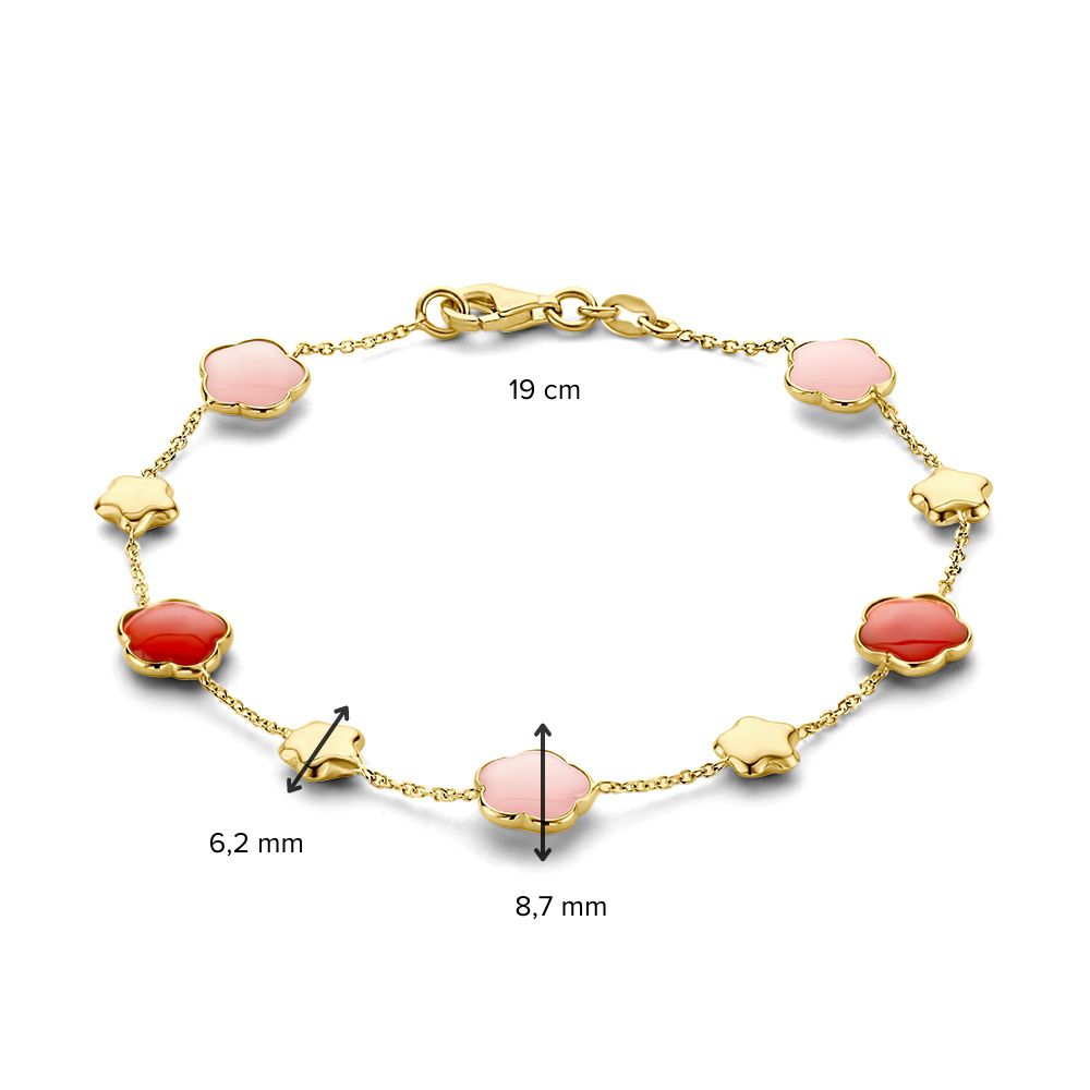 Deze armband is afkomstig van het merk Excellent Jewelry dat alweer 25 jaar een toonaangevende Nederlandse sieradenleverancier en vaste partner van vele Nederlandse juweliershuizen is. Deze armband is gemaakt van goud van de allerbeste kwaliteit en bestaat uit meerdere slanke schakels die fijntjes op elkaar aansluiten en die samen een stijlvol geheel vormen, met rondom meerdere bloemvormige plaatjes die om en om voorzien zijn van een roze carneool of roze chalcedoon edelsteen ter decoratie. Aan de achterkant zit een handige karabijnsluiting, waardoor u deze armband gemakkelijk om- en afdoet. De armband heeft een gewicht van 4,3 gram met een totale lengte van 19cm.