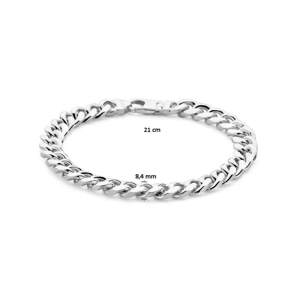 Deze robuuste zilveren herenarmband is gemaakt van 925 zilver en heeft een brede gourmette schakel van 8,4 mm. Met een draaglengte van 21 cm biedt de herenarmband een comfortabele pasvorm. De zeszijdig geslepen schakels en de gepolijste afwerking zorgen voor een opvallende glans, terwijl de karabijnsluiting zorgt voor een stevige en veilige sluiting. Dit heren sieraad is een stijlvol en duurzaam sieraad, perfect voor mannen die houden van tijdloze en kwalitatieve accessoires.