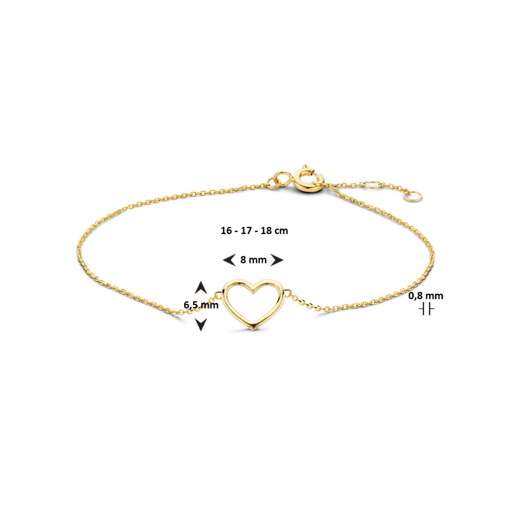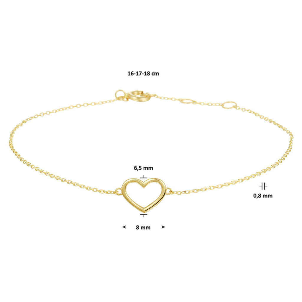 Dit fijne 14k geelgouden armbandje met een open hartje geeft je outfit een vriendelijke touch. De armband heeft draaglengtes van 16, 17 en 18cm. Het hart heeft een formaat van 6,5 x 8mm. Romantisch!