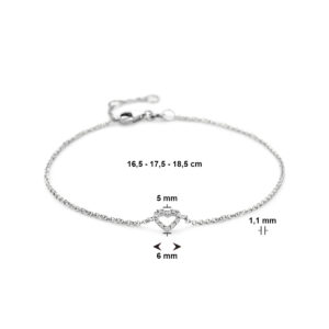14k Witgouden armband uitgevoerd met een hart en schitterende diamant. De armband heeft draaglengtes van 16.5-17.5-18.5cm en de afmeting van het hart is 5x6mm. Het diamantgewicht is 0.04ct. Uitgevoerd met karabijnsluiting. De schakelbreedte is 1.1mm.