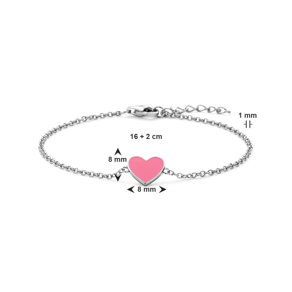 Gerhodineerd 925 zilveren armband uitgevoerd met een hart en roze emaille. De armband heeft een draaglengte van 16cm met 2cm extensie. Uitgevoerd met karabijn sluiting. De schakelbreedte is 1mm.