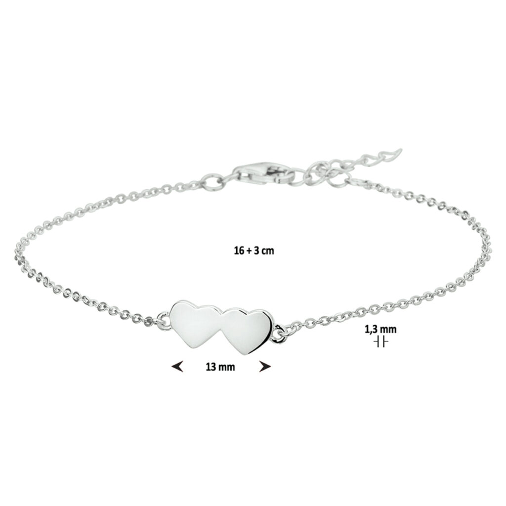 Gerhodineerd zilveren 1.3mm anker armband met een lengte van 16cm en een extensie van 3cm uitgevoerd met 2 hartjes van 6x13mm. De armband is te combineren met bijpassende sieraden uit onze collectie.