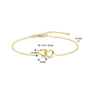 14k Geelgouden armband uitgevoerd met twee harten. De armband heeft draaglengtes van 16, 17.5 en 19cm. Uitgevoerd met karabijn sluiting. De schakelbreedte is 1.3mm.