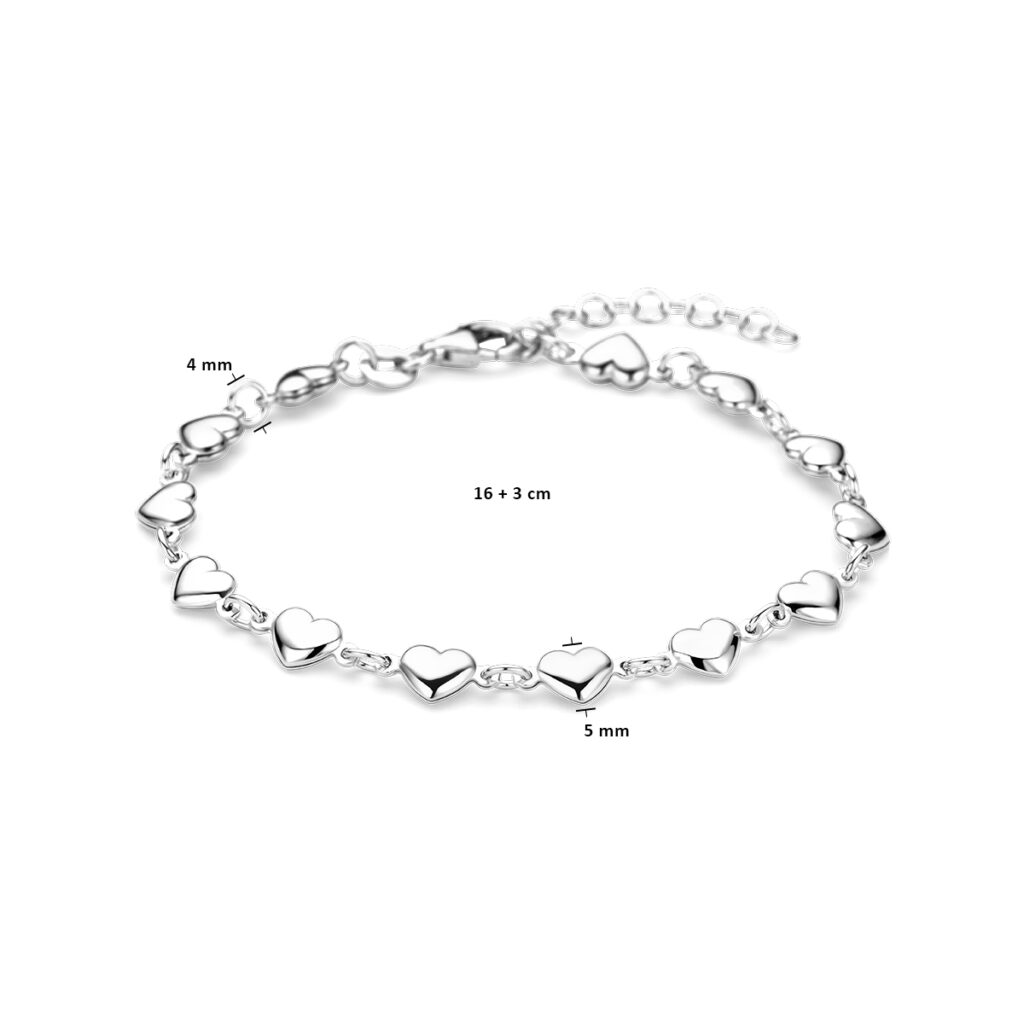 Gerhodineerd 925 zilveren armband uitgevoerd met hartjes en een karabijn sluiting. De armband heeft een draaglengte van 16cm en een extensie van 3cm.