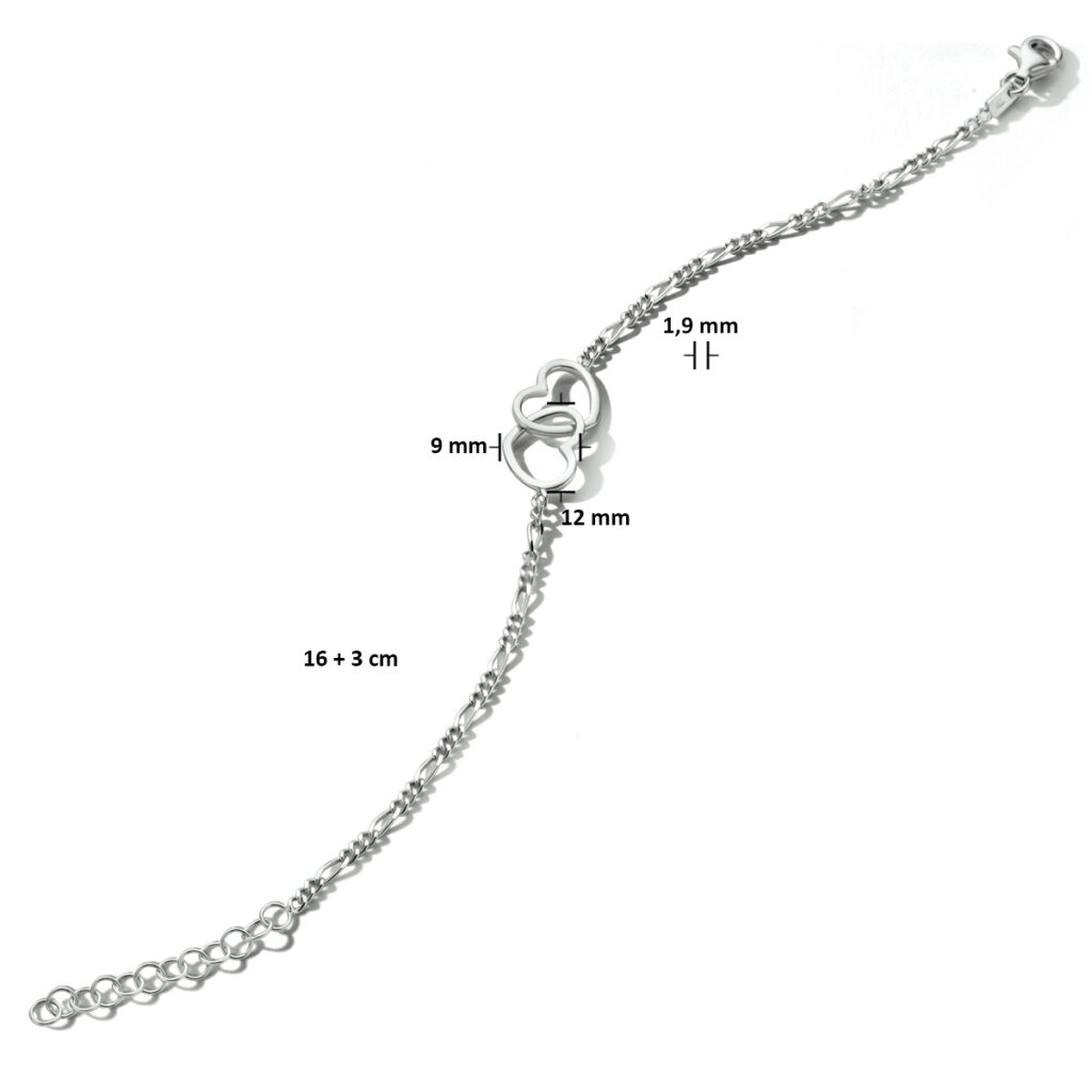 Gerhodineerd 925 zilveren figaro armband uitgevoerd met twee hartjes. De armband heeft een draaglengte van 16cm met een extensie van 3cm en een stevige karabijn sluiting. De hartjes hebben een afmeting van 9x12mm. De schakelbreedte is 1.9mm.