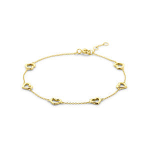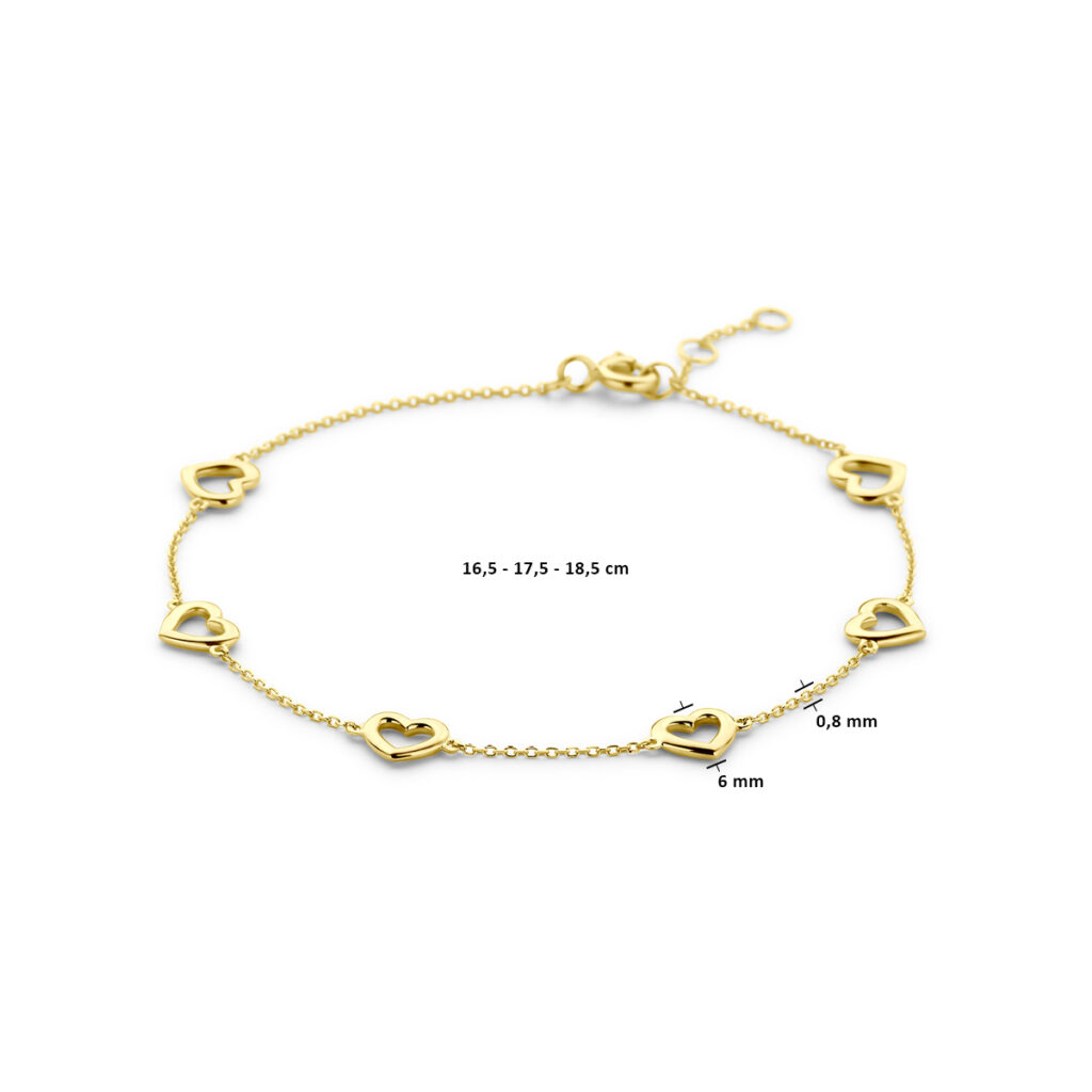 14k Geelgouden armband uitgevoerd met hartjes. De armband heeft draaglengtes van 16.5, 17.5 en 18.5cm. De schakelbreedte is 0.8mm.