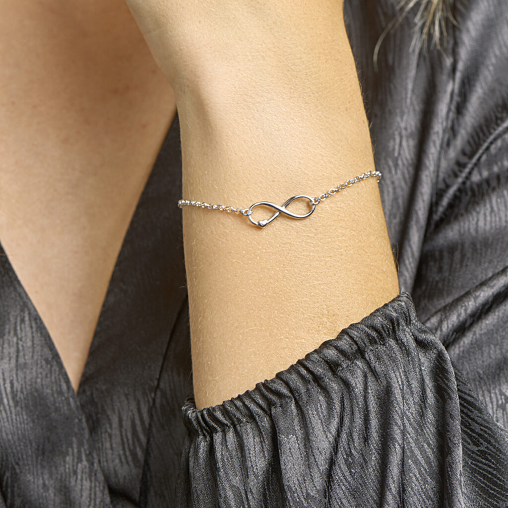 Deze Infinity met Hart Fantasie Armband van Zilver is volledig gemaakt van 925 sterling zilver, de allerbeste kwaliteit zilver, en bestaat uit een slanke anker schakelketting met een kopstuk in de vorm van het welbekende Infinity teken dat links onderin versierd is met een fijntjes afgewerkt hartje. Zowel de ketting alsook het Infinity teken is bedekt met een laagje rhodium, waardoor de glans extra lang behouden blijft. Daarnaast is deze armband voorzien van een handige karabijnsluiting, waarmee u deze armband gemakkelijk om- en afdoet. Deze Infinity met Hart Fantasie Armband van Zilver is speciaal voor dames en heeft een lengte van 19cm. Deze armband behoort tevens tot onze huiscollectie, waardoor u verzekerd bent van de allerbeste kwaliteit tegen de scherpste prijzen!
