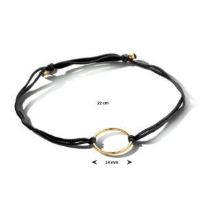 Zwart gevlochten armband uitgevoerd met een geelgoud op 925 zilveren rondje. De armband heeft een maximale draaglengte van 22cm. Geen garantie op plating.