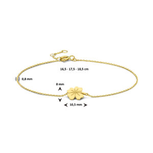 14k Geelgouden armband met een klavertje. De armband heeft draaglengtes van 16.5,17.5 en 18.5cm. De schakelbreedte is 0.8mm.