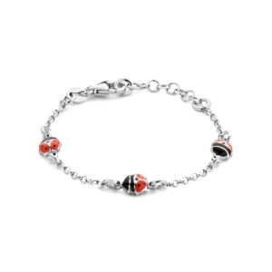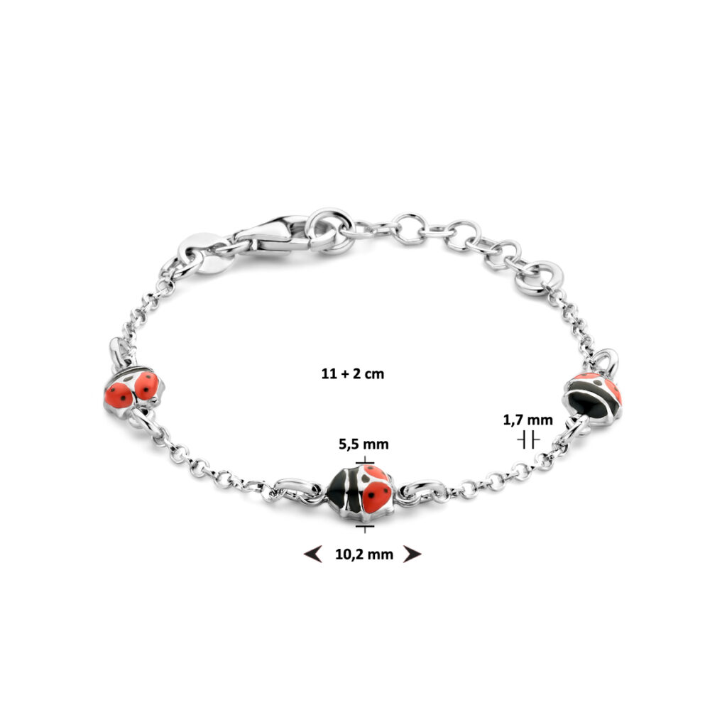 Gerhodineerd 925 zilveren armband uitgevoerd met een lieveheersbeestjes en een karabijn sluiting. De armband heeft een draaglengte van 11cm en een extensie van 2cm. De schakelbreedte is 1.7mm.