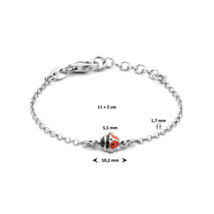 Deze traditionele Zilveren Kinderarmband met Lieveheersbeestje Rood is vervaardigd uit gepolijst 925 Sterling zilver, dat is voorzien van een gerhodineerde coating. De armband is opgebouwd uit Jasseron schakels met een schakelbreedte van 1,7 mm en heeft een metaalgewicht van circa 1,47 gram. De draaglengte van deze armband is 11 cm met een extensie van 2 cm. In het midden van de kinderarmband is een zwart met rood lieveheersbeestje bevestigd met een hoogte van 5,5 mm en een breedte van 10,2 mm. De armband wordt gesloten met een karabijnsluiting.