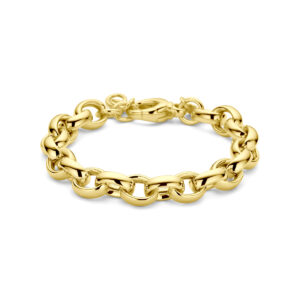 Geelgoud op 925 zilveren ovaal jasseron armband. De schakelbreedte is Uitgevoerd met een karabijn sluiting.