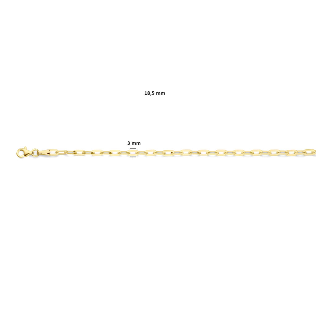 14k Geelgouden armband uitgevoerd met paperclip schakel. De armband heeft een draaglengte van 18.5cm en een schakelbreedte van 3mm. Uitgevoerd met karabijnsluiting.