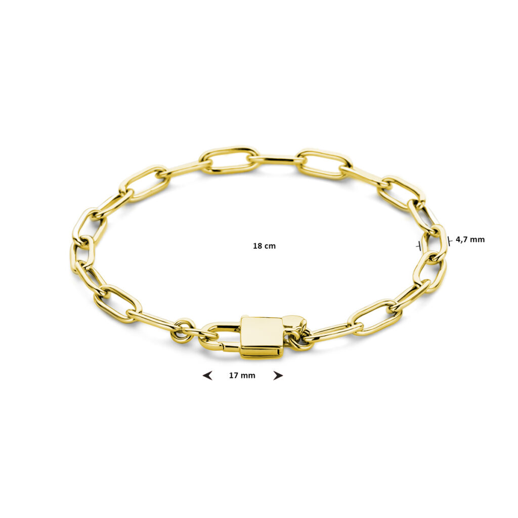 Geelgoud op 925 zilveren armband uitgevoerd met een slot. De armband heeft een draaglengte van 18cm en een schakelbreedte van 4.7mm.