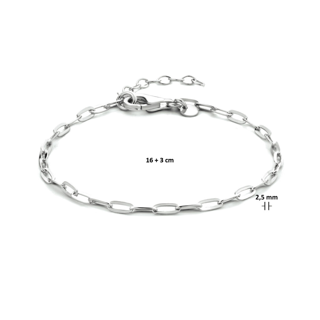 Gerhodineerd 925 zilveren paperclip armband uitgevoerd met een karabijnslot. De armband heeft een draaglengte van 16cm en een extensie van 3cm. De schakelbreedte is 2.5mm.