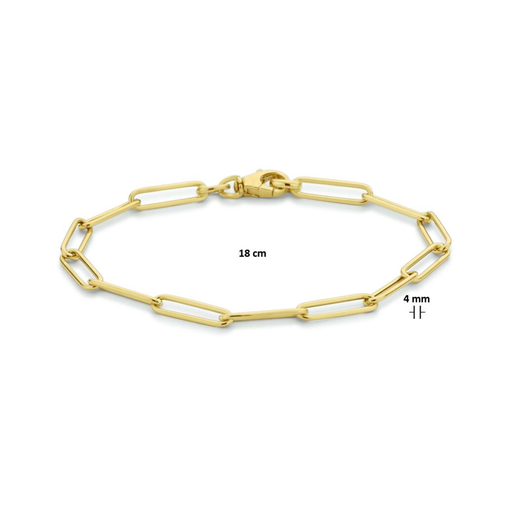 Deze prachtige armband is gemaakt van 14 karaat goud, de allerbeste kwaliteit goud, met een fijntjes gepolijst oppervlak dat mooi glanst. De armband bestaat uit meerdere paperclip schakels die samen een mooi geheel vormen. Deze schakels hebben een breedte van 4 mm. De armband is voorzien van een stevige karabijn sluiting, waarmee u het sieraad gemakkelijk om- en afdoet. De draaglengte is 18 cm. Het is ook mogelijk om deze armband te combineren met een van onze bijpassende colliers.