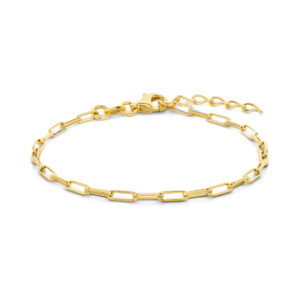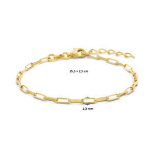 Geelgoud op 925 zilveren paperclip armband uitgevoerd met een karabijn sluiting. De armband heeft een draaglengte van 15.5cm en een extensie van 2.5cm. De schakelbreedte is 2.3mm.