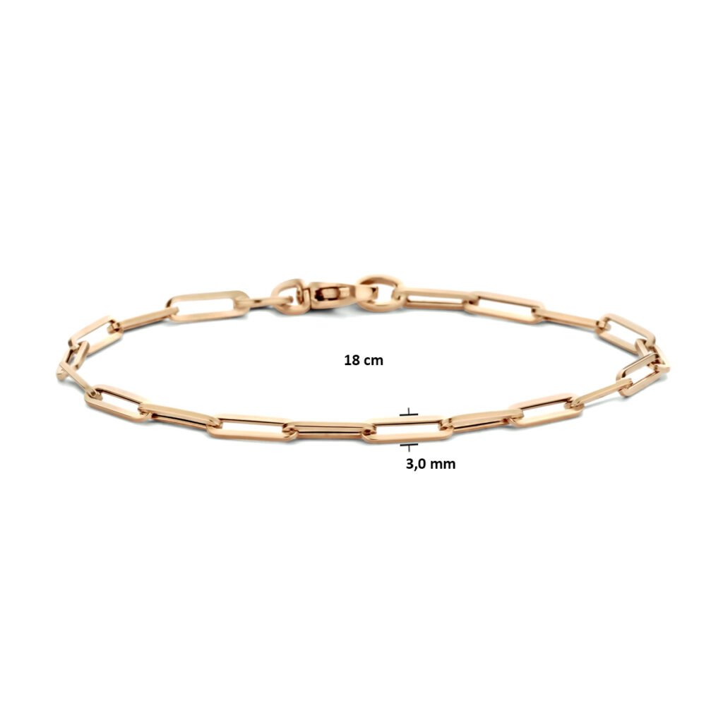 14k Rosegouden armband uitgevoerd met een paperclip schakel met een breedte van 3mm. De armband heeft een draaglengte van 18cm en een stevige karabijn sluiting.