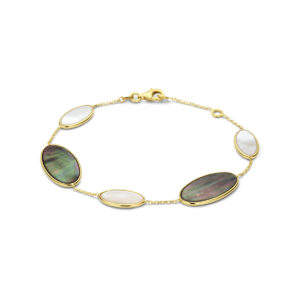 14k Geelgouden armband uitgevoerd met ovaalvormige elementen met parelmoer. De armband heeft draaglengtes van 17 en 19cm. De schakelbreedte is 1.1mm. De armband heeft een karabijn sluiting.