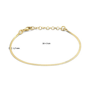 Geelgoud op 925 zilveren armband met een breedte van 1.7mm. De armband heeft een draaglengte van 16cm met een extensie van 3cm en een stevige karabijn sluiting.