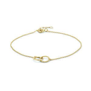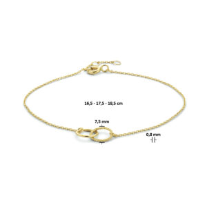 14k Geelgouden armband uitgevoerd met twee rondjes met een diameter van 7.5mm. De armband heeft draaglengtes van 16.5, 17.5 en 18.5cm. De schakelbreedte is 0.8mm.