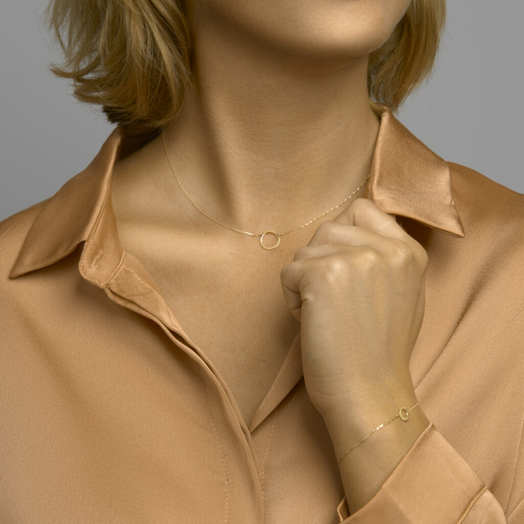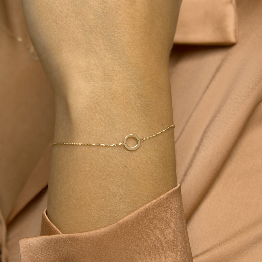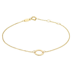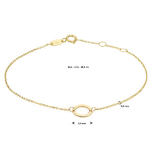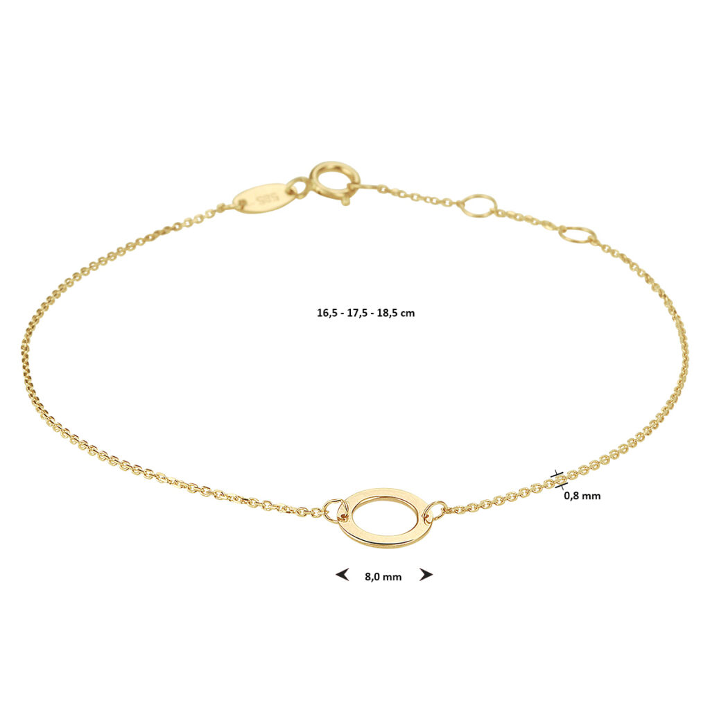 14k Geelgouden armband uitgevoerd met een rondje. De armband heeft draaglengtes van 16.5, 17.5 en 18.5cm. Het rondje heeft een diameter van 8mm. De schakelbreedte is 0.8mm.