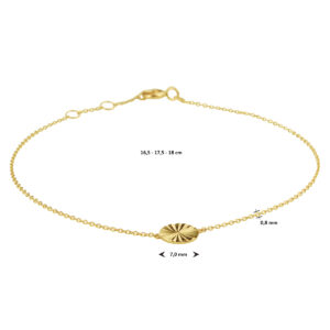 Deze armband met rond plaatje ter decoratie is gemaakt van 14 karaats geelgoud, de allerbeste kwaliteit geelgoud, met een fijntjes gepolijst oppervlak dat mooi glanst. Deze armband bestaat uit meerdere slanke Anker schakels die fijntjes op elkaar aansluiten en die samen een stijlvol geheel vormen, met aan de voorkant een rond plaatje ter decoratie. Aan de achterkant zit een handige karabijnsluiting, waardoor u deze armband gemakkelijk om- en afdoet. De armband heeft een maximale lengte van 18cm met draaglengtes van 16,5cm, 17,5cm en 18cm.