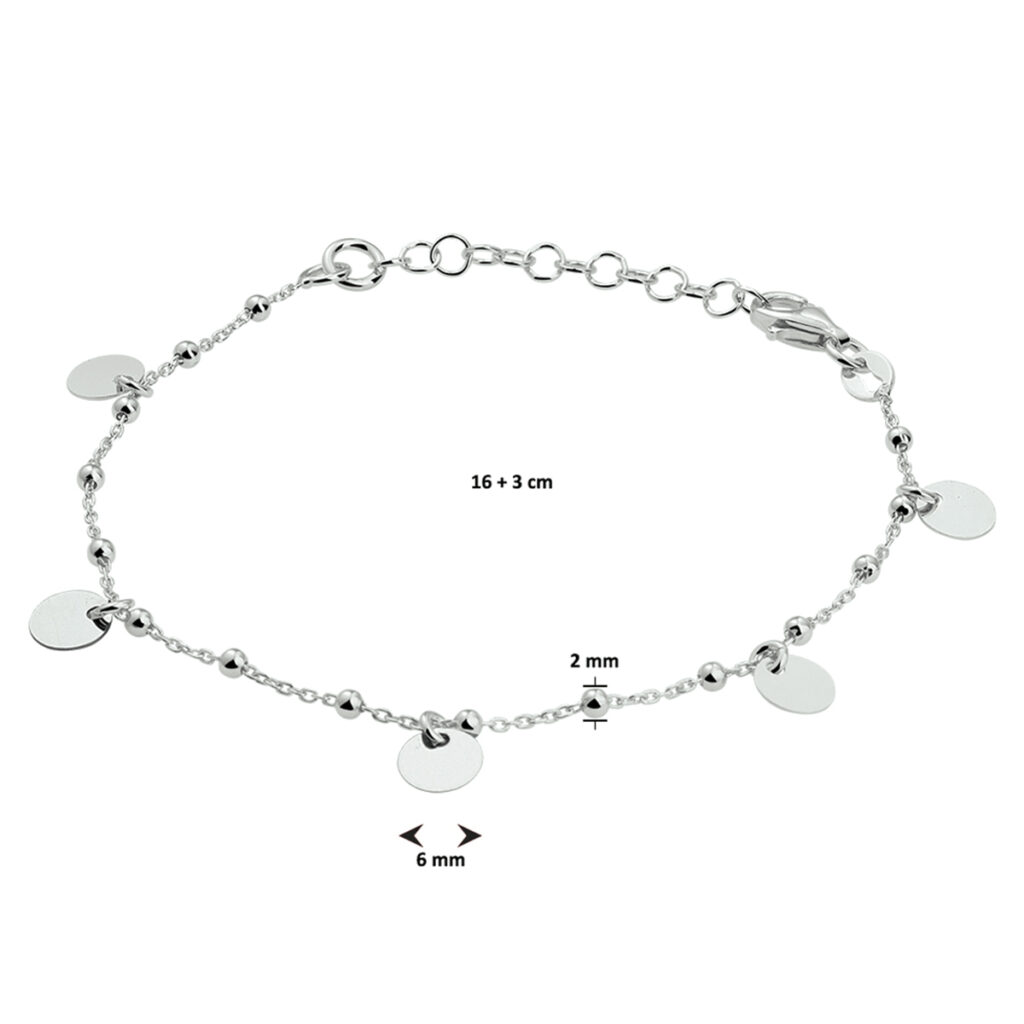 Deze schakelarmband met ronde plaatjes is gemaakt van 925 sterling zilver, de allerbeste kwaliteit zilver, met een fijntjes gepolijst oppervlak dat mooi glanst met een laagje rhodium waardoor die glans mooi behouden blijft. Deze armband bestaat uit meerdere mooie schakels die fijntjes op elkaar aansluiten en die samen een stijlvol geheel vormen, met meerdere ronde plaatjes. Deze armband is aan de achterkant voorzien van een handige karabijnsluiting, waardoor u deze armband gemakkelijk om- en afdoet. De armband is tevens voorzien van een verlengstukje van 3cm en heeft een maximale lengte van 19cm.