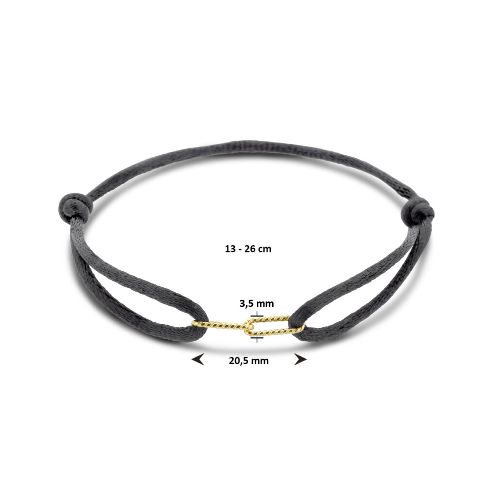 Zwart gevlochten rubber/nylon/leren armband uitgevoerd met een 14k geelgouden, schakelachtig element. De armband heeft draaglengtes van 13 tot 26cm.