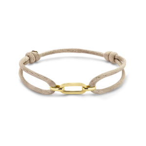 Beige gevlochten rubber/nylon/leren armband uitgevoerd met 14k geelgouden element. De armband heeft draaglengtes van 13 tot 26cm. Het element heeft een breedte van 6mm.