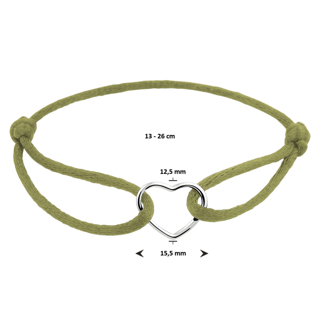 Mosgroen gevlochten leren dames armband uitgevoerd met een gerhodineerd 925 zilveren hartje. De armband heeft draaglengtes van 13 tot 26cm. Het hartje heeft een afmeting van 12.5×15.5mm