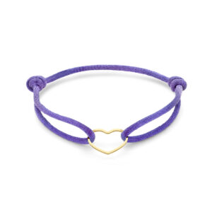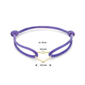 Paars gevlochten armband uitgevoerd met geelgoud op 925 zilveren hartje. De armband heeft draaglengtes van 13 tot 26cm en het hartje heeft een afmeting van 12.5×15.5mm. Geen garantie op plating.