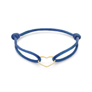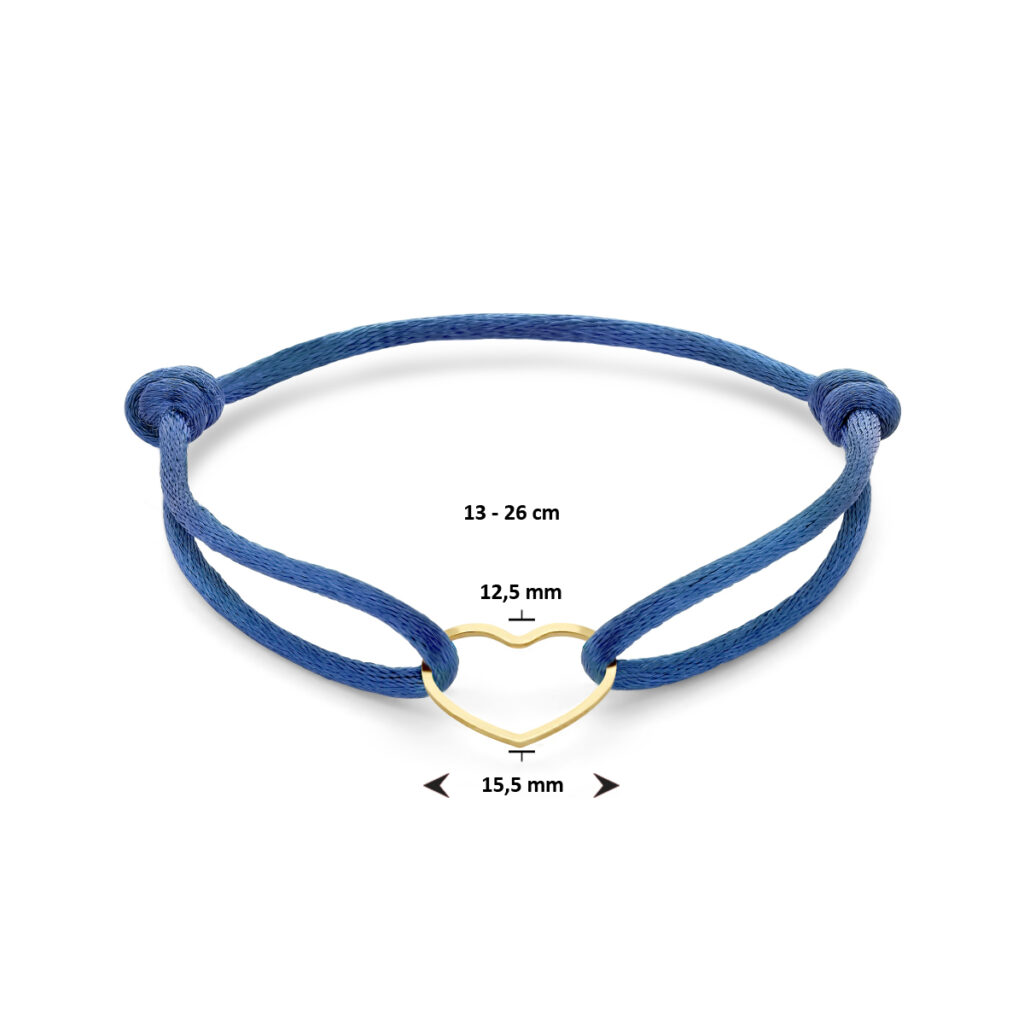 Blauw gevlochten armband uitgevoerd met geelgoud op 925 zilveren hartje. De armband heeft draaglengtes van 13 tot 26cm en het hartje heeft een afmeting van 12.5×15.5mm. Geen garantie op plating.