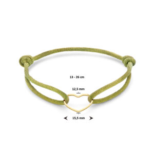 Mosgroen gevlochten armband uitgevoerd met geelgoud op 925 zilveren hartje. De armband heeft draaglengtes van 13 tot 26cm en het hartje heeft een afmeting van 12.5×15.5mm. Geen garantie op plating.