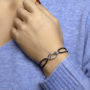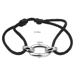 Deze Zwarte Satijnen Dames Armband is volledig gemaakt van een koord van satijn met meerdere zilveren schakels die zijn gemaakt van 925 sterling zilver, de allerbeste kwaliteit zilver, met een fijntjes gepolijst oppervlak dat mooi glanst en een laagje rhodium waardoor de glans extra lang behouden blijft. De armband bestaat grotendeels uit satijn, met aan de voorkant twee kleine schakels en één grotere schakel. De armband is gemakkelijk om en af te doen dankzij de knoop sluiting aan de achterzijde. De armband heeft draaglengtes van 13cm tot 26cm en is speciaal ontworpen voor dames.