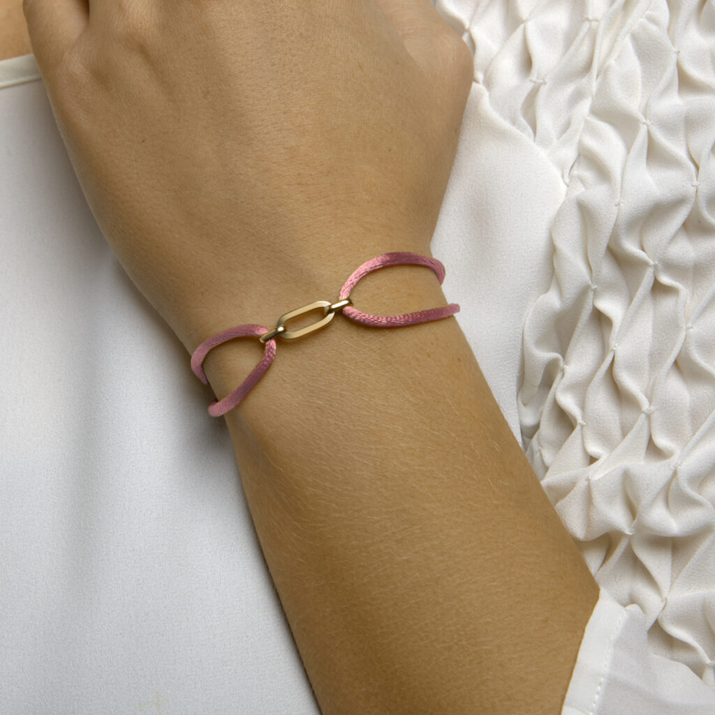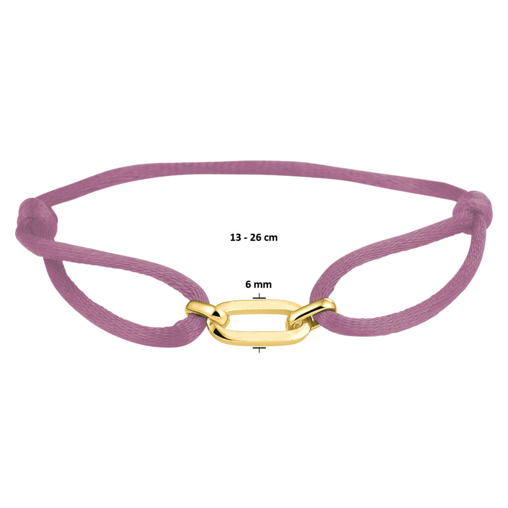 Oud roze gevlochten armband uitgevoerd met een geelgoud op 925 zilveren element. De armband heeft draaglengtes van 13 tot 26cm. Het element heeft een afmeting van 20x6mm. Geen garantie op plating.
