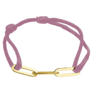 Oud roze gevlochten armband uitgevoerd met een geelgoud op 925 zilveren element. De armband heeft draaglengtes van 13 tot 26cm. Het element heeft een afmeting van 40x5mm. Geen garantie op plating.